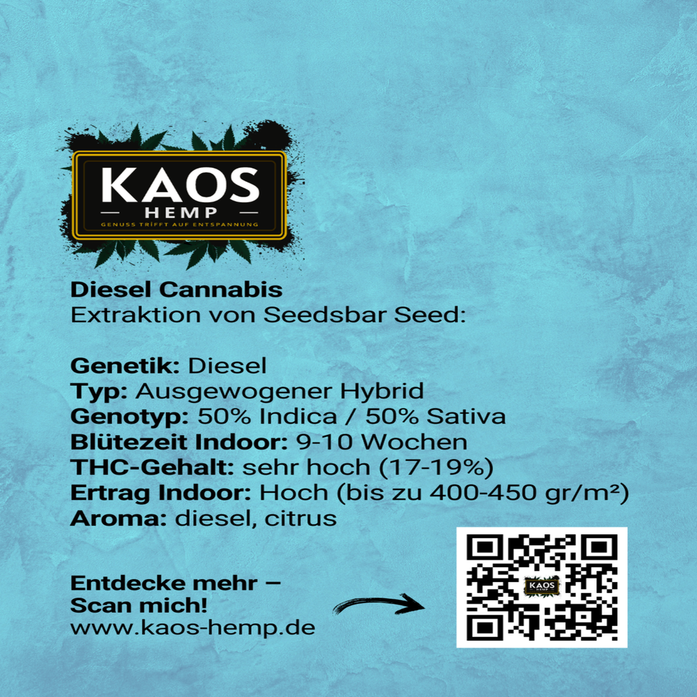 Ob Sie ein erfahrener Züchter oder Anfänger sind, Diesel überzeugt mit einfacher Handhabung, einer kurzen Blütezeit und einem Endprodukt, das höchste Ansprüche erfüllt. Diese Sorte bietet nicht nur ein erstklassiges Anbauerlebnis, sondern auch hochwertige Knospen, die selbst Kenner begeistern.