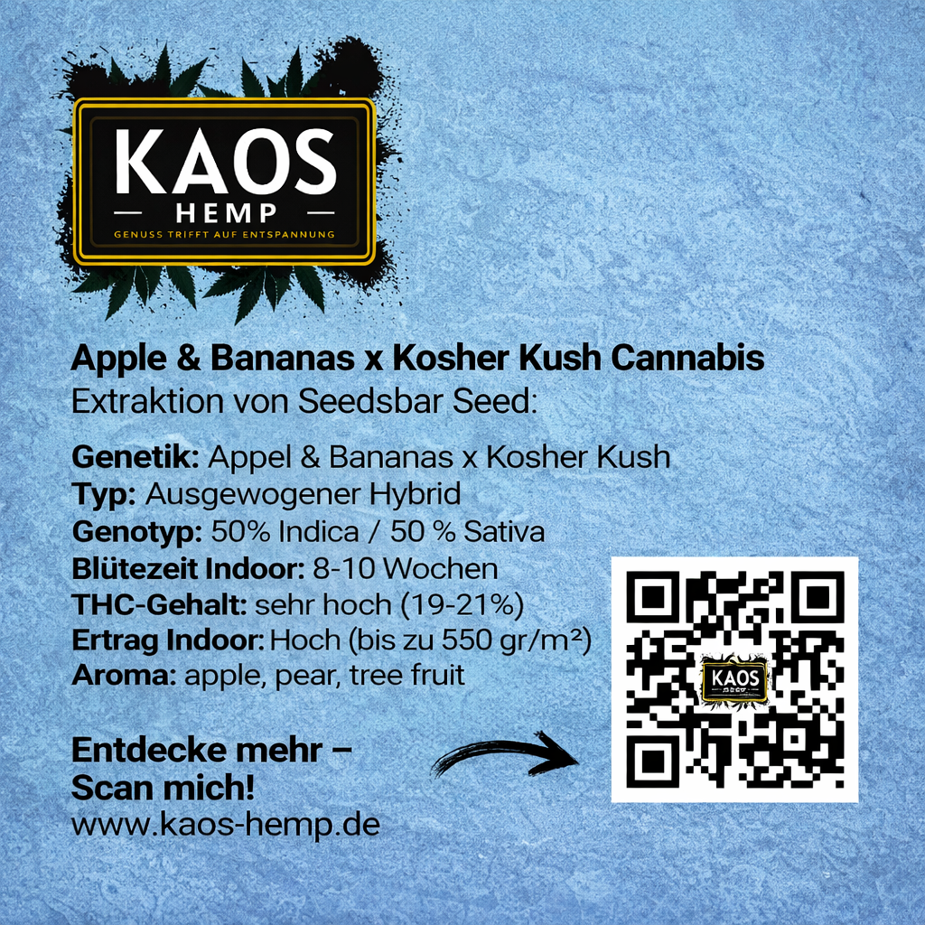 Willkommen in der faszinierenden Welt von Apple & Bananas x Kosher Kush Cannabis-Samen, einer exquisiten Hybrid-Sorte, die eine reiche Ernte und unvergleichliche Aromen verspricht. Diese Sorte kombiniert das Beste aus beiden Welten und bietet ein erfrischendes Erlebnis für Cannabisliebhaber auf der ganzen Welt.