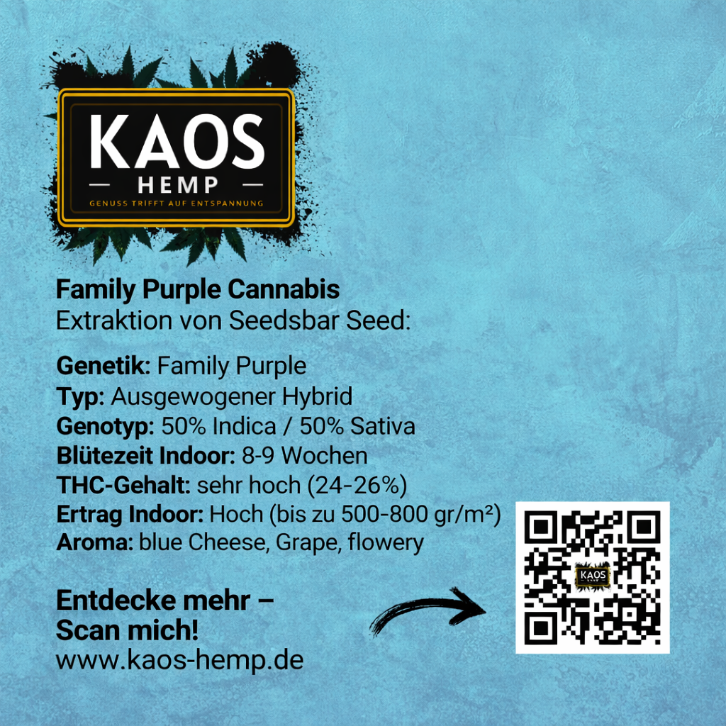 Mit einem beeindruckenden THC-Gehalt von 25 % bietet Family Purple ein intensives High, das den Geist anregt und den Körper entspannt. Als Hybrid-Sorte vereint sie die besten Eigenschaften von Indica und Sativa und schafft ein angenehmes Gleichgewicht, das sowohl für geistige Klarheit als auch für körperliche Entspannung sorgt.