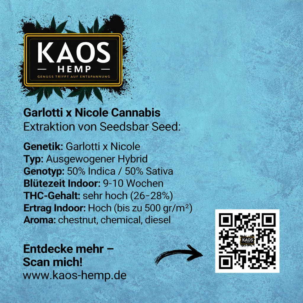 Garlotti x Nicole, eine Hybrid-Sorte mit einem THC-Gehalt von 27%, kombiniert die reichen Aromen von Garlotti mit den kraftvollen Eigenschaften von Nicole. Diese ausgewogene Mischung aus Indica und Sativa eignet sich perfekt für eine Vielzahl von Anwendungen, sei es für gesellige Treffen oder für eine entspannte Zeit alleine.