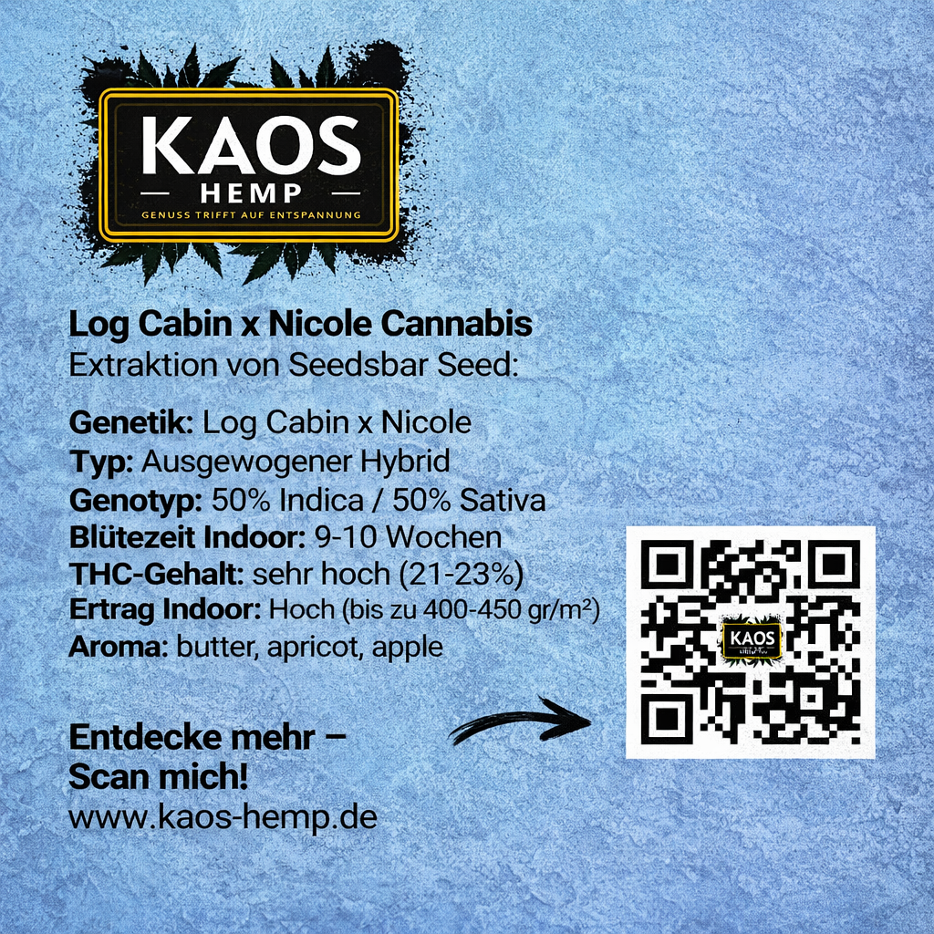 Willkommen zu einer wahren Geschmacksexplosion mit unseren Log Cabin x Nicole Cannabissamen, einer faszinierenden Hybrid-Sorte, die mit ihrem einzigartigen Aroma und ihrer kraftvollen Wirkung beeindruckt. Diese Sorte bietet ein intensives und dennoch ausgewogenes Erlebnis für Cannabisliebhaber, die nach einem reichhaltigen Geschmack und einer starken Wirkung suchen.