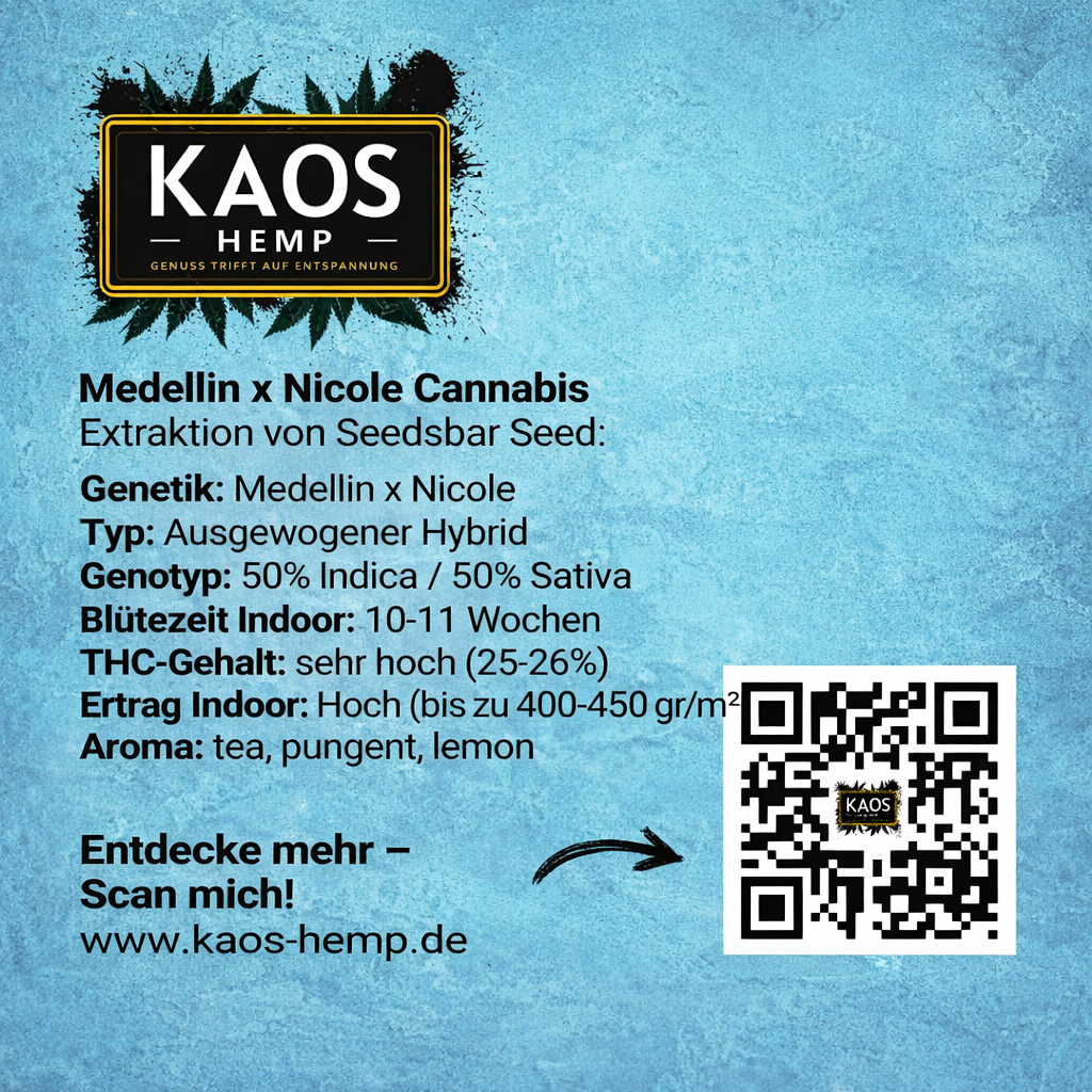 Medellin x Nicole, eine Hybrid-Sorte mit einem beeindruckenden THC-Gehalt von 25%, bietet ein kraftvolles High, das den Geist anregt und den Körper entspannt. Diese ausgewogene Mischung aus Indica und Sativa eignet sich perfekt für diejenigen, die nach einem starken und dennoch ausgewogenen Erlebnis suchen.