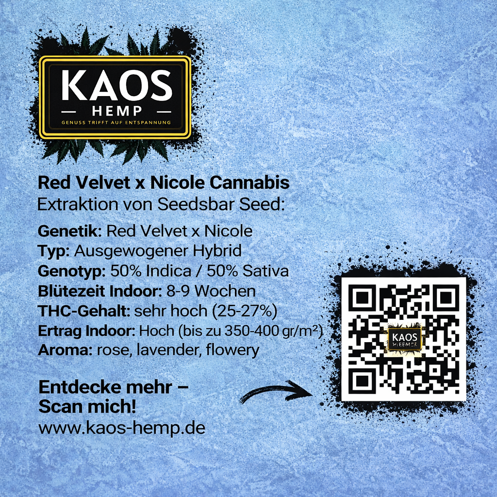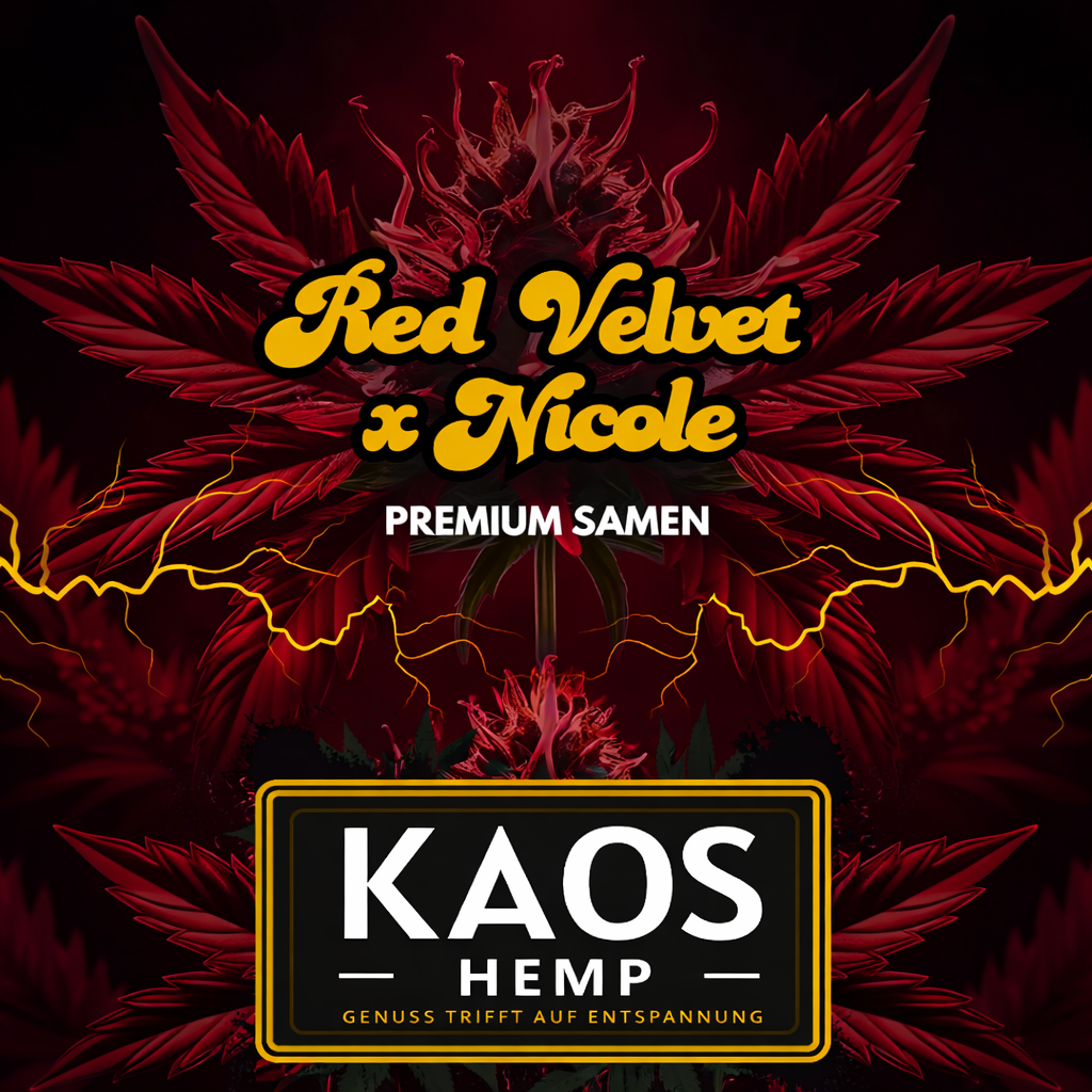 Flowertime: Die Blütezeit der RED VELVET X NICOLE beträgt etwa 60 Tage. Während dieser Zeit entwickelt die Pflanze ihre charakteristischen Blüten, die mit einem reichen Aroma und einer Fülle von Wirkstoffen gefüllt sind.