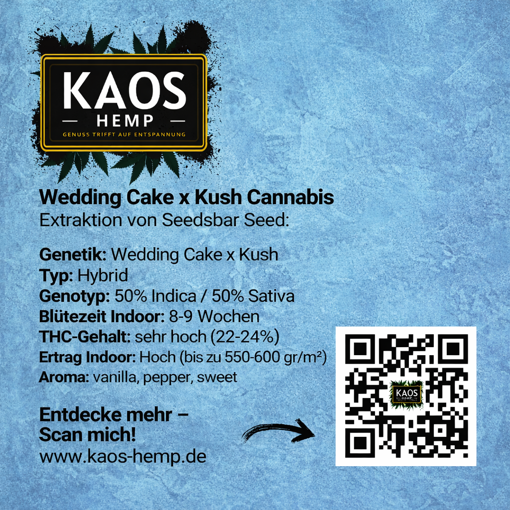 Geschmack: Genießen Sie eine verlockende Aromenpalette mit Noten von Vanille, Pfeffer und Süße. WEDDING CAKE X KUSH bietet ein köstliches Geschmackserlebnis, das den Gaumen umschmeichelt und die Sinne erfreut.