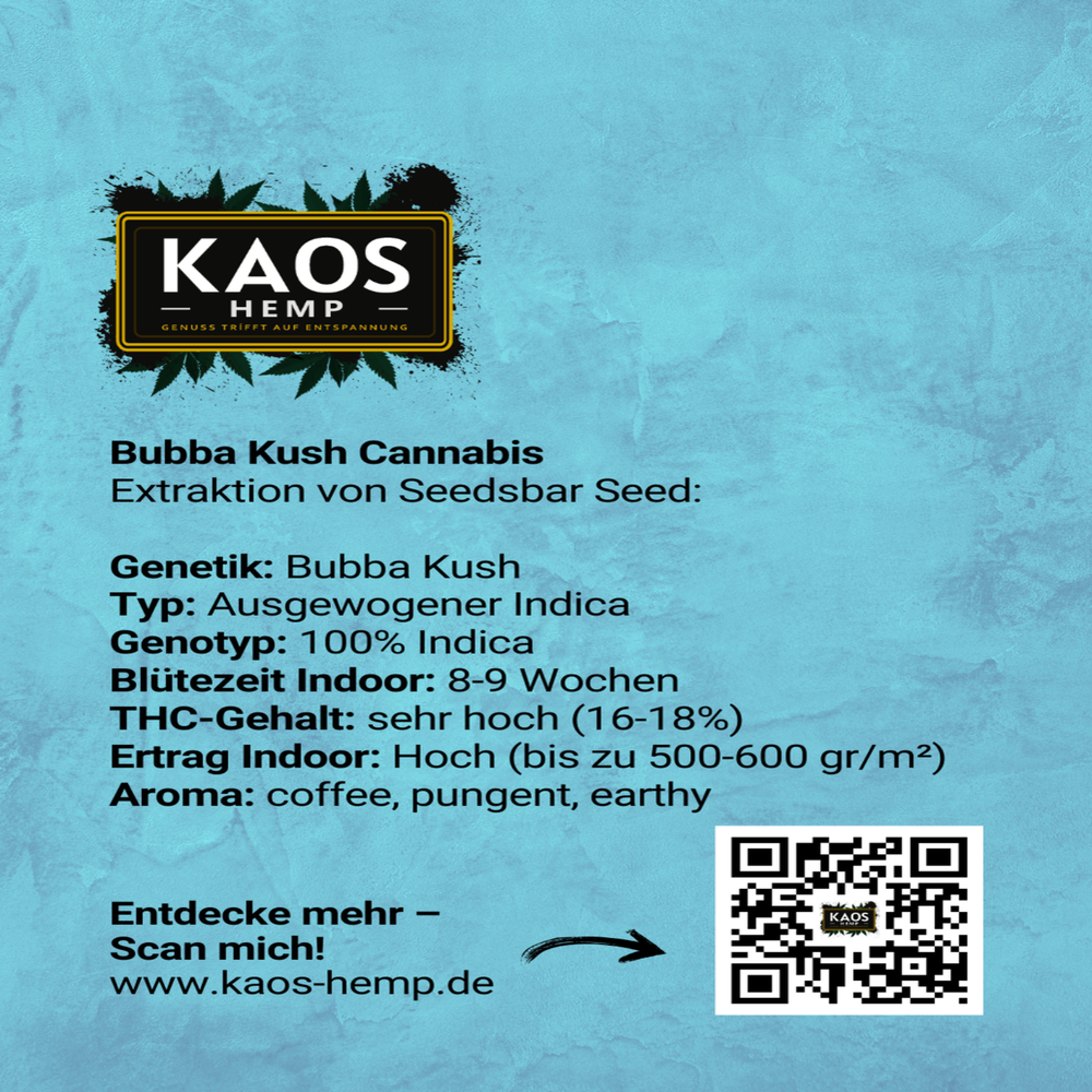 Der Geschmack von Bubba Kush ist eine verlockende Mischung aus Kaffee, einem intensiven Aroma und erdigen Noten. Jeder Zug entfacht ein Fest für die Sinne, das Ihre Geschmacksknospen verwöhnt und Sie in eine Welt der sinnlichen Aromen entführt.
