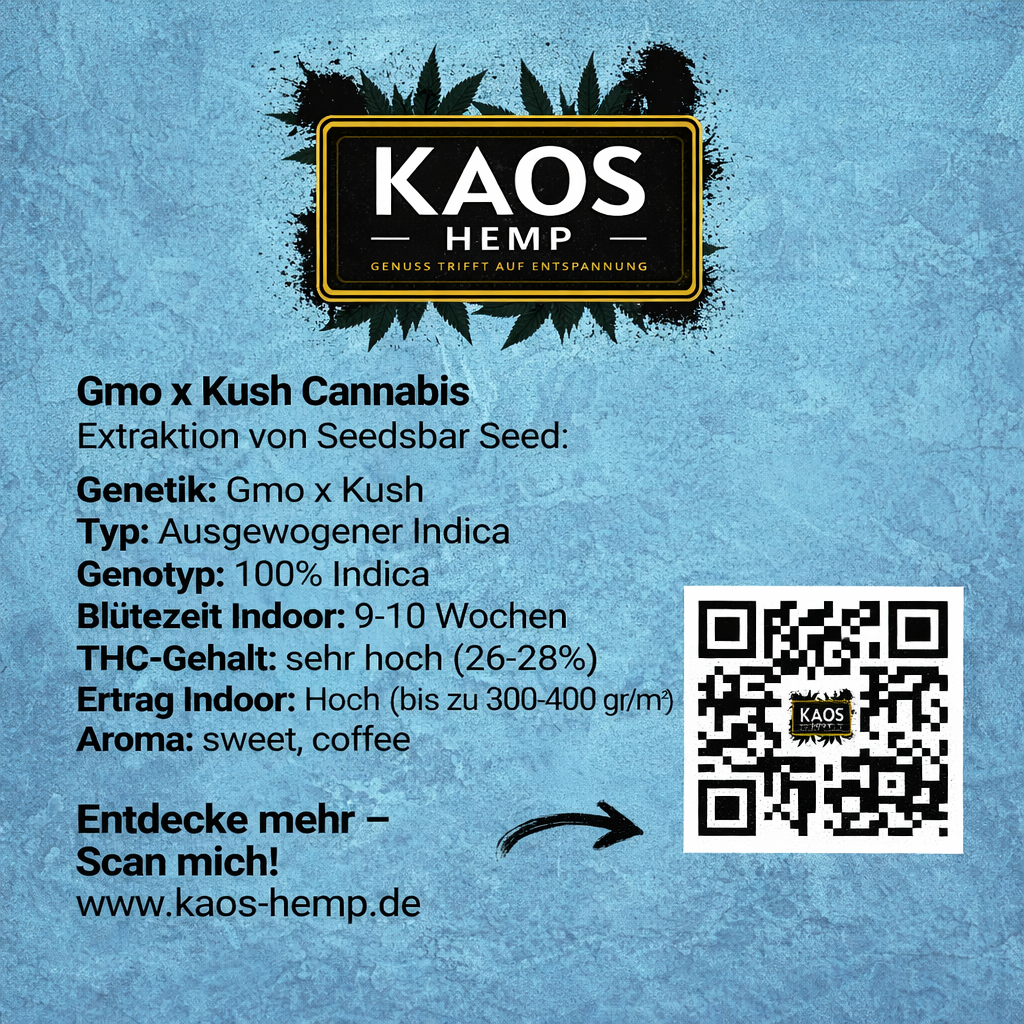 Indica / Sativa: Als Indica-dominante Sorte bietet unsere GMO KUSH die typischen entspannenden und beruhigenden Effekte, die für Indica bekannt sind. Ideal für Entspannung, Stressabbau und tiefe Ruhe.