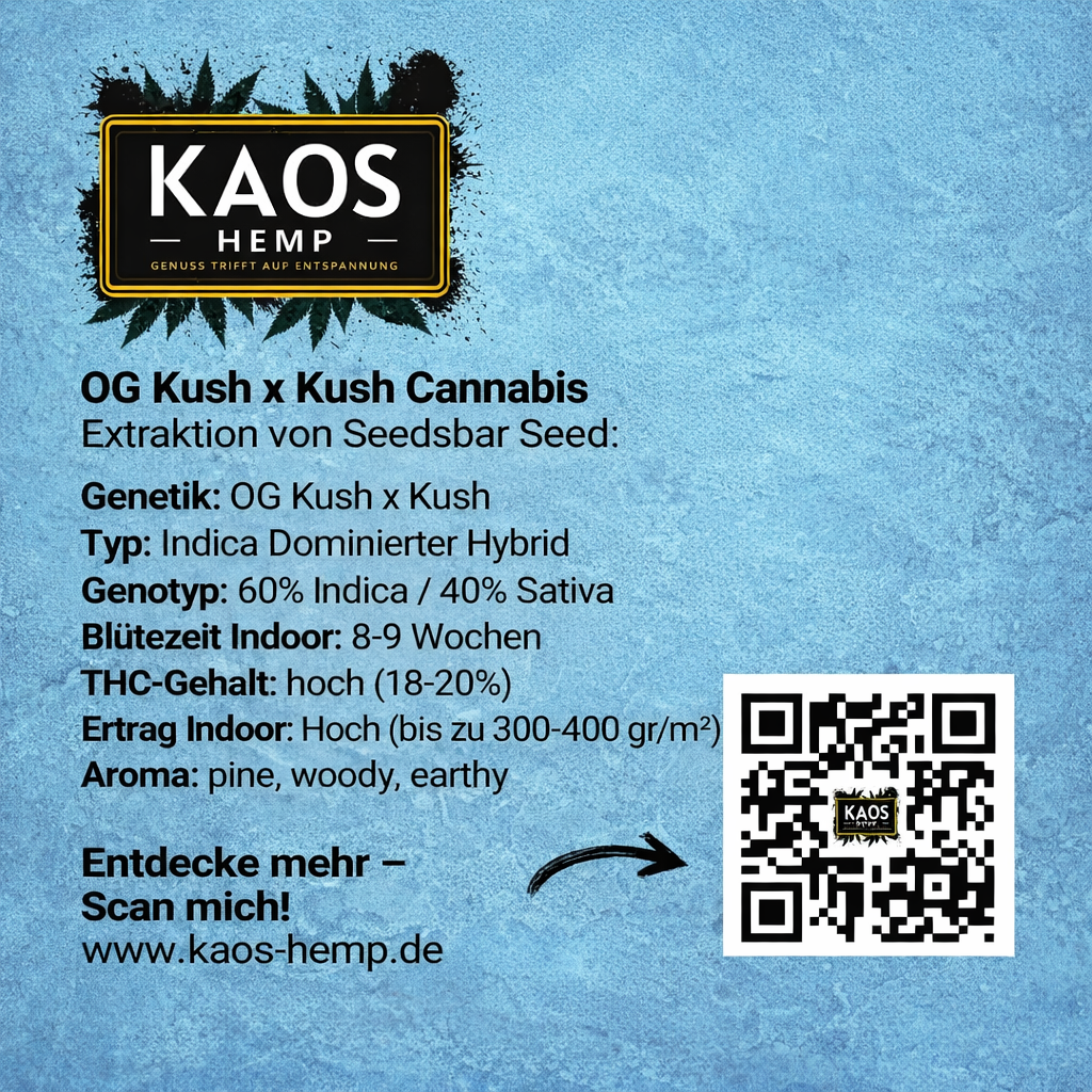 Geschmack: Genießen Sie ein unverwechselbares Geschmackserlebnis mit Noten von Kiefer, Holz und Erde. Unsere OG KUSH X KUSH bietet einen authentischen Geschmack, der den Gaumen umschmeichelt und die Sinne belebt.