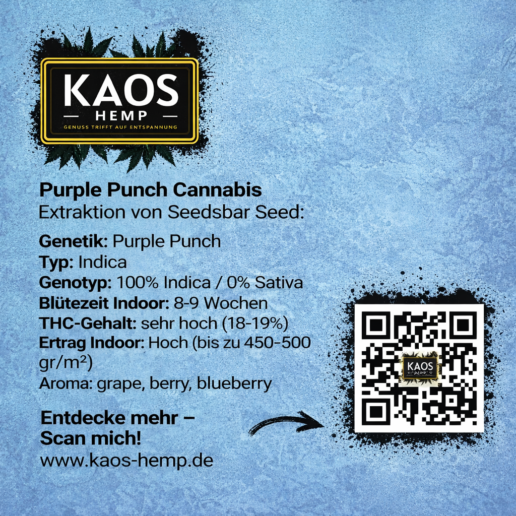 Insgesamt ist PURPLE PUNCH eine bemerkenswerte Indica-dominante Sorte, die durch ihre großzügigen Erträge, betörenden Aromen und entspannenden Effekte jeden Cannabis-Enthusiasten begeistern wird. Entdecken Sie die faszinierende Welt dieser Sorte und lassen Sie sich von ihrer Qualität überzeugen.