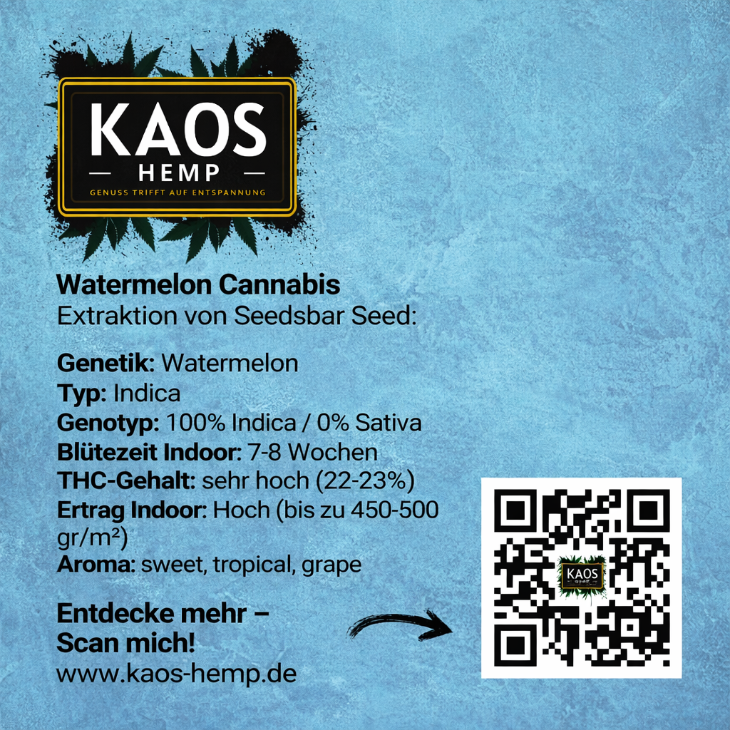 Entdecken Sie die süße Verlockung von Watermelon Kush, einer Indica-Sorte, die mit ihrem tropischen Aroma und ihrem erhebenden Rausch begeistert. Diese Sorte bietet ein reichhaltiges und dennoch entspannendes Erlebnis für Cannabisliebhaber, die nach einer angenehmen Geschmacksvielfalt und einer tiefen Entspannung suchen.